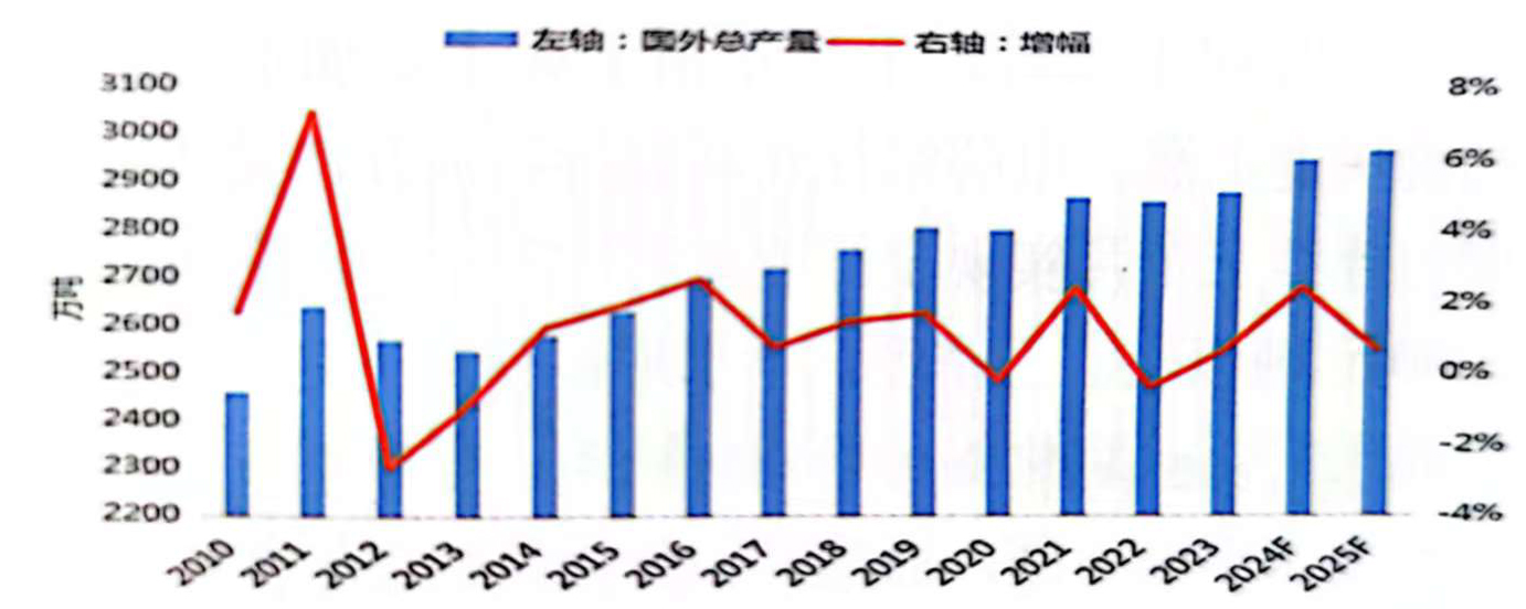 圖2-2 2010-2025F國(guó)外電解鋁產(chǎn)量