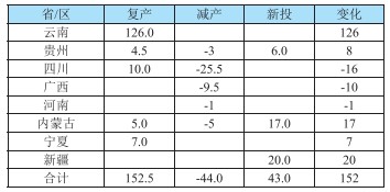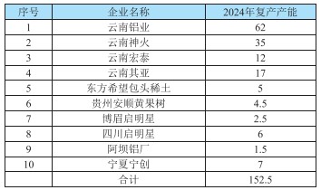 表2-2 2024年中國(guó)電解鋁復(fù)產(chǎn)產(chǎn)能變動(dòng)情況(萬(wàn)噸/年)