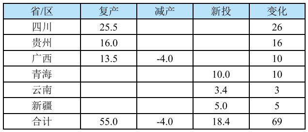 2025年復(fù)產(chǎn)產(chǎn)能55萬噸/年,主要分布在四川、貴州和廣西等省/區(qū),復(fù)產(chǎn)產(chǎn)能大部分來自2024年底由于經(jīng)營壓力過大而關(guān)停的企業(yè),還有一部分來自于技改后投放的項目。