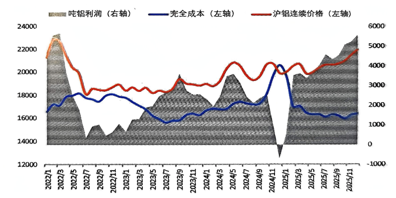 2025年,氧化鋁、電力等原材料及能源價格下跌帶動電解鋁成本下降,同時受海外供應(yīng)擾動、需求預(yù)期增長以及美聯(lián)儲降息等多重因素影響,電解鋁價格繼續(xù)上行,全行業(yè)保持較高盈利水平。尤其四季度,隨著價格重心顯著抬升,噸鋁利潤飆升至5000元以上。